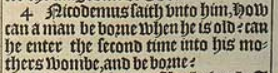 4 Nicodemus saith vnto him, How can a man be borne when he is old? can he enter the second time into his mothers wombe, and be borne?