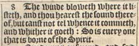 8 The winde bloweth where it listeth, and thou hearest the sound thereof, but canst not tel whence it commeth, and whither it goeth: So is euery one that is borne of the Spirit.