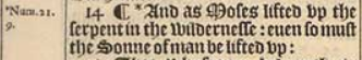 14 ¶ *And as Moses lifted vp the serpent in the wildernesse: euen so must the Sonne of man be lifted vp:[*Num.21.9.]