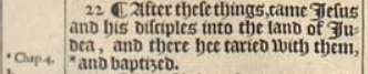 22 ¶ After these things, came Iesus and his disciples into the land of Iudea, and there hee taried with them, *and baptized.[*Chap.4.2.]