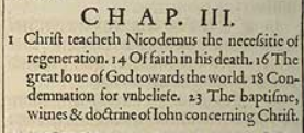 1 Christ teacheth Nicodemus the necessitie of regeneration. 14 Of faith in his death. 16 The great loue of God towards the world. 18 Condemnation for vnbeliefe. 23 The baptisme, witnes & doctrine of Iohn concerning Christ.