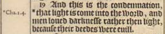 19 And this is the condemnation, *that light is come into the world, and men loued darknesse rather then light, because their deedes were euill.[*Cha.1.4. ]