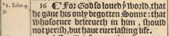 16 ¶ *For God so loued þe world, that he gaue his only begotten Sonne: that whosoeuer beleeueth in him, should not perish, but haue euerlasting life.[*Iohn 4.9.]