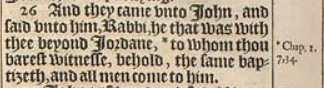 26 And they came vnto Iohn, and said vnto him, Rabbi, he that was with thee beyond Iordane, *to whom thou barest witnesse, behold, the same baptizeth, and all men come to him.[*Chap.1.7,34.]