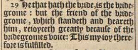 29 He that hath the bride, is the bridegrome: but the friend of the bridegrome, which standeth and heareth him, reioyceth greatly because of the bridegromes voice: This my ioy therefore is fulfilled.