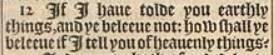 12 If I haue tolde you earthly things, and ye beleeue not: how shall ye beleeue if I tell you of heauenly things?