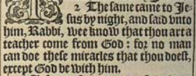 2 The same came to Iesus by night, and said vnto him, Rabbi, wee know that thou art a teacher come from God: for no man can doe these miracles that thou doest, except God be with him.