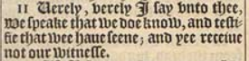 11 Uerely, verely I say vnto thee, We speake that we doe know, and testifie that wee haue seene; and yee receiue not our witnesse.