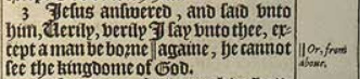 3 Iesus answered, and said vnto him, Uerily, verily I say vnto thee, except a man be borne ||againe, he cannot see the kingdome of God.[||Or, from aboue.]