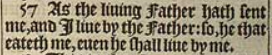 57 As the liuing Father hath sent me, and I liue by the Father: so, he that eateth me, euen he shall liue by me.