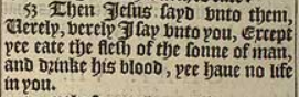 53 Then Iesus sayd vnto them, Uerely, verely I say vnto you, Except yee eate the flesh of the sonne of man, and drinke his blood, yee haue no life in you.