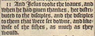 11 And Iesus tooke the loaues, and when he had giuen thankes, hee distributed to the disciples, and the disciples to them that were set downe, and likewise of the fishes, as much as they would.