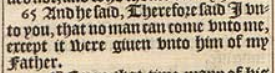 65 And he said, Therefore said I vnto you, that no man can come vnto me, except it were giuen vnto him of my Father.