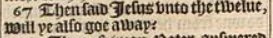67 Then said Iesus vnto the twelue, Will ye also goe away?