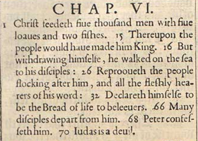 1 Christus speist fünftausend Menschen mit fünf Laiben und zwei Fischen. 15 Daraufhin wollten die Leute ihn zum König machen. 16 Aber sich zurückziehend, ging er auf der See zu seinen Jüngern: 26 Tadelt das Volk, das ihm nachlief und all die fleischlichen Hörer seines Wortes. 32 Erklärt, selbst das Brot des Lebens für Gläubige zu sein. 66 Viele Jünger weichen von ihm. 68 Petrus bekennt sich zu ihm. 70 Judas ist ein Teufel.