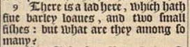 9 There is a lad here, which hath fiue barley loaues, and two small fishes: but what are they among so many?