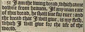 51 I am the liuing bread, which came downe from heauen. If any man eate of this bread, he shall liue for euer: and the bread that I will giue, is my flesh, which I will giue for the life of the world.