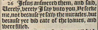 26 Iesus answered them, and said, Uerely, verely I say vnto you, Ye seeke me, not because ye saw the miracles, but because yee did eate of the loaues, and were filled.