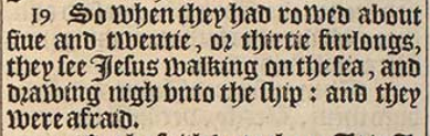 19 So when they had rowed about fiue and twentie, or thirtie furlongs, they see Iesus walking on the sea, and drawing nigh vnto the ship: and they were afraid.