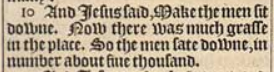 10 And Iesus said, Make the men sit downe. Now there was much grasse in the place. So the men sate downe, in number about fiue thousand.