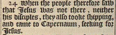 24 When the people therefore saw that Iesus was not there, neither his disciples, they also tooke shipping, and came to Capernaum, seeking for Iesus.