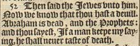 52 Then said the Iewes vnto him, Now we know that thou hast a deuill. Abraham is dead, and the Prophets: and thou sayest, If a man keepe my saying, he shall neuer taste of death.