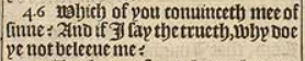 46 Which of you conuinceth mee of sinne? And if I say the trueth, why doe ye not beleeue me?