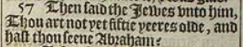 57 Then said the Iewes vnto him, Thou art not yet fiftie yeeres olde, and hast thou seene Abraham?