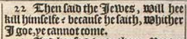 22 Then said the Iewes, Will hee kill himselfe? because he saith, Whither I goe, ye cannot come.