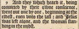 9 And they which heard it, being conuicted by their owne conscience, went out one by one, beginning at the eldest, euen vnto the last: and Iesus was left alone, and the woman standing in the midst.