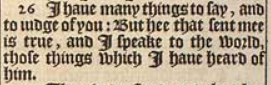 26 I haue many things to say, and to iudge of you: But hee that sent mee is true, and I speake to the world, those things which I haue heard of him.
