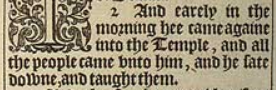 2 And earely in the morning hee came againe into the Temple, and all the people came vnto him, and he sate downe, and taught them.