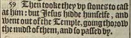 59 Then tooke they vp stones to cast at him: but Iesus hidde himselfe, and went out of the Temple, going thorow the midst of them, and so passed by.