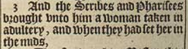 3 And the Scribes and Pharisees brought vnto him a woman taken in adultery, and when they had set her in the mids,