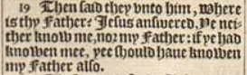 19 Then said they vnto him, Where is thy Father? Iesus answered, Ye neither know me, nor my Father: if ye had knowen mee, yee should haue knowen my Father also.