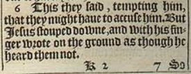 6 This they said, tempting him, that they might haue to accuse him. But Iesus stouped downe, and with his finger wrote on the ground as though he heard them not.
