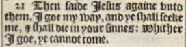 21 Then saide Iesus againe vnto them, I goe my way, and ye shall seeke me, & shall die in your sinnes: Whither I goe, ye cannot come.