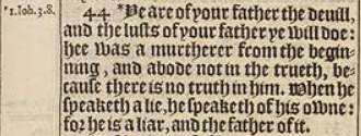 44 *Ye are of your father the deuill, and the lusts of your father ye will doe: hee was a murtherer from the beginning, and abode not in the trueth, because there is no truth in him. When he speaketh a lie, he speaketh of his owne: for he is a liar, and the father of it.[*1.Ioh.3.8.]