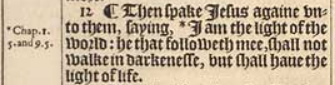 12 ¶ Then spake Iesus againe vnto them, saying, *I am the light of the world: he that followeth mee, shall not walke in darkenesse, but shall haue the light of life.[*Chap.1. 5.and 9.5.]
