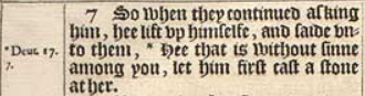 7 So when they continued asking him, hee lift vp himselfe, and saide vnto them, *Hee that is without sinne among you, let him first cast a stone at her.[*Deut. 17.7.]