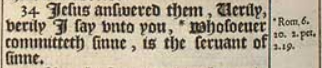 34 Iesus answered them, Uerily, verily I say vnto you, *Whosoeuer committeth sinne, is the seruant of sinne.[*Rom.6. 20. 2.pet. 2.19.]