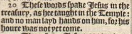 20 These words spake Iesus in the treasury, as hee taught in the Temple: and no man layd hands on him, for his houre was not yet come.