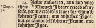 14 Iesus answered, and said vnto them, *Though I beare record of my selfe, yet my record is true: for I know whence I came, and whither I goe: but ye cannot tell whence I come, and whither I goe.[*Chap.5. 31.]