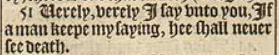 51 Uerely, verely I say vnto you, If a man keepe my saying, hee shall neuer see death.