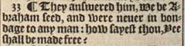 33 ¶ They answered him, We be Abraham seed, and were neuer in bondage to any man: how sayest thou, Yee shall be made free?