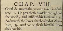 1 Christus errettet die Frau, die beim Ehebruch ergriffen wurde. 12 Er verkündet sich selbst als das Licht der Welt und begründet seine Lehre. 33 Antwortet den Juden, die sich Abrahams brüsteten 59 Und befördert sich selbst aus ihrer Grausamkeit.