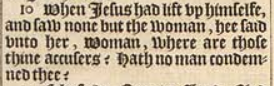 10 When Iesus had lift vp himselfe, and saw none but the woman, hee said vnto her, Woman, where are those thine accusers? Hath no man condemned thee?