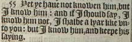 55 Doch ihr habt ihn nicht erkannt, aber ich kenne ihn: Und wenn ich sagen würde 'Ich kenne ihn nicht', wäre ich ein Lügner wie ihr: Aber ich kenne ihn und halte sein Wort ein.