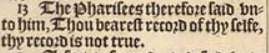 13 The Pharisees therefore said vnto him, Thou bearest record of thy selfe, thy record is not true.