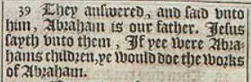 39 They answered, and said vnto him, Abraham is our father. Iesus sayth vnto them, If yee were Abrahams children, ye would doe the works of Abraham.